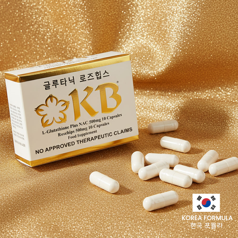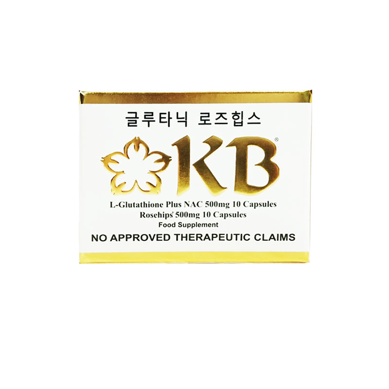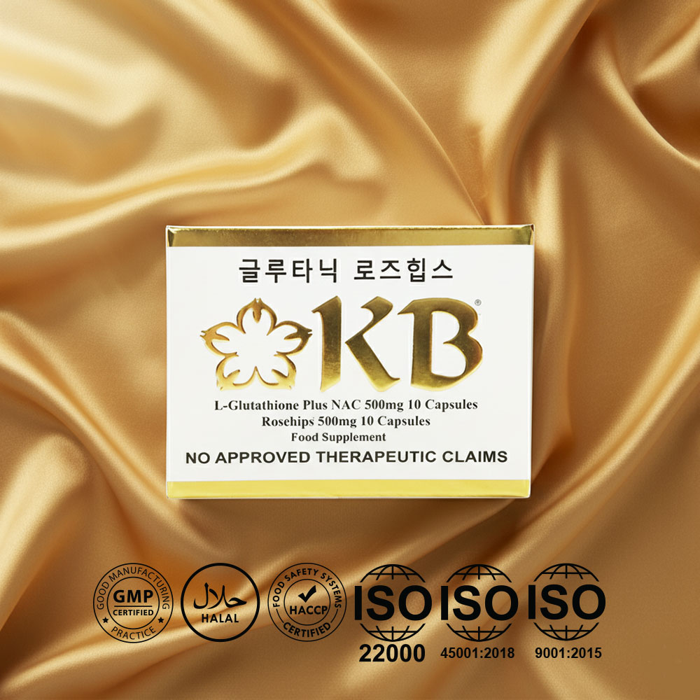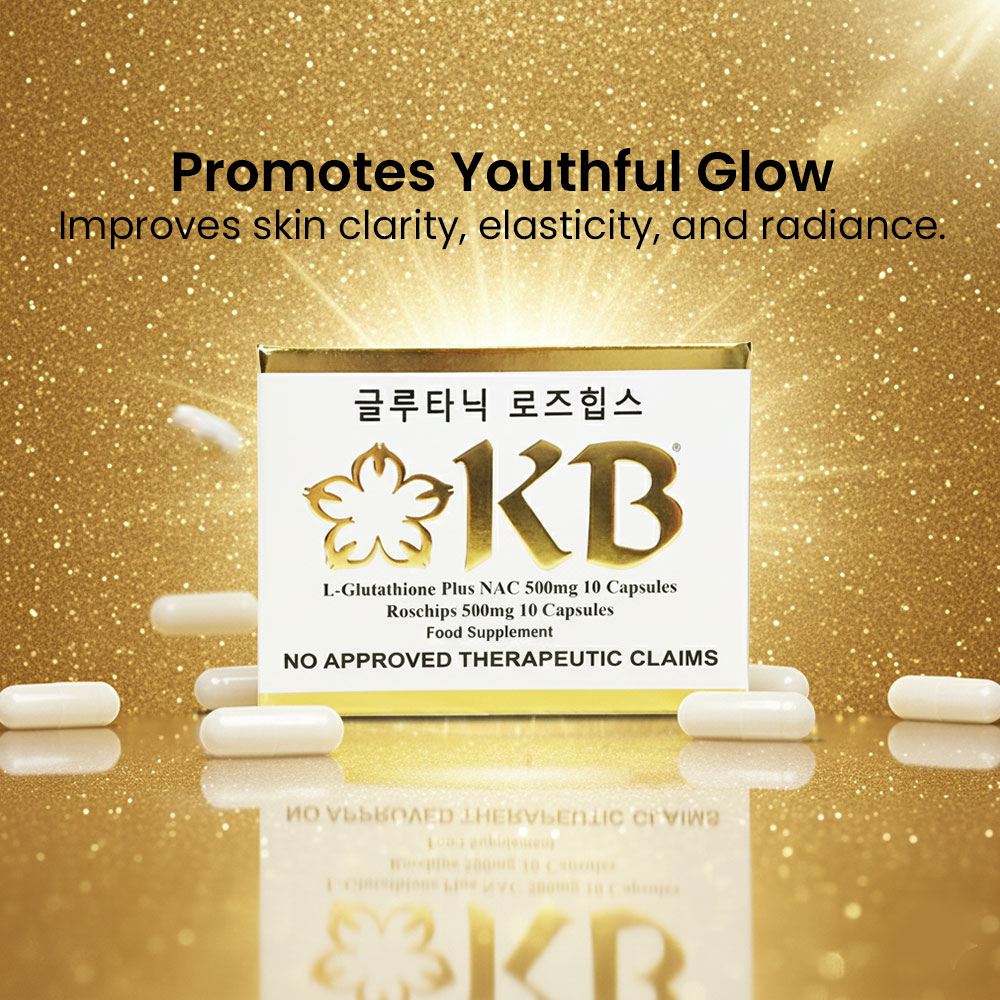 KB Glutathione + KB Rosehips is a dietary supplement formulated to promote brighter, healthier, and more youthful-looking skin. It combines the powerful antioxidant L-Glutathione with Rosehips extract, a rich source of Vitamin C, to help detoxify the body and enhance the natural skin-whitening process.