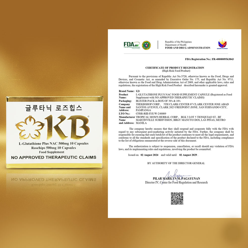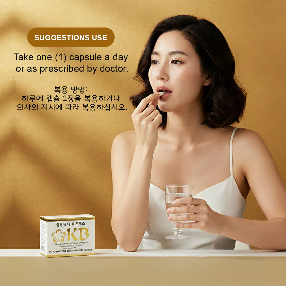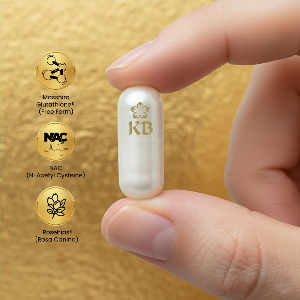 KB Glutathione + KB Rosehips is a dietary supplement formulated to promote brighter, healthier, and more youthful-looking skin. It combines the powerful antioxidant L-Glutathione with Rosehips extract, a rich source of Vitamin C, to help detoxify the body and enhance the natural skin-whitening process.