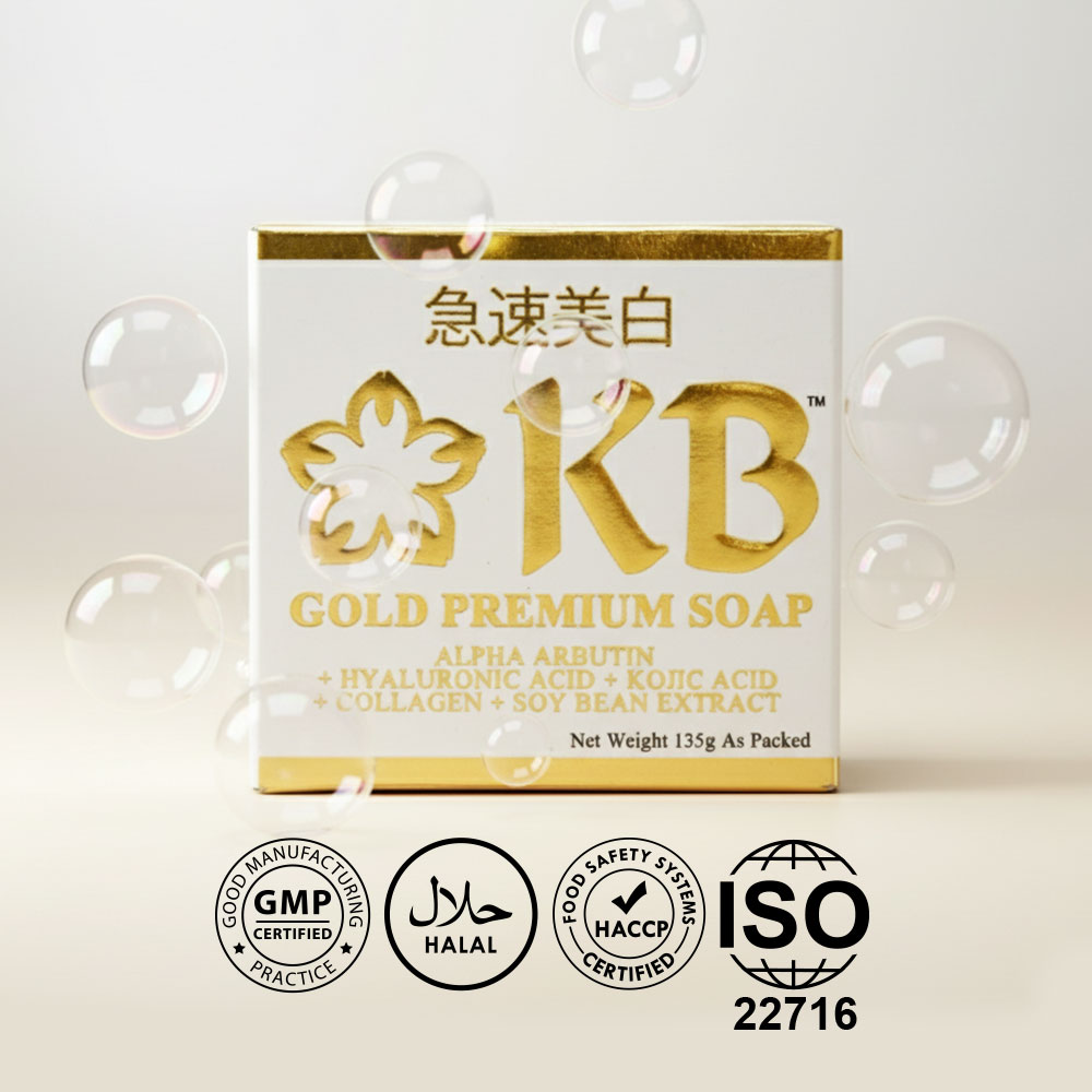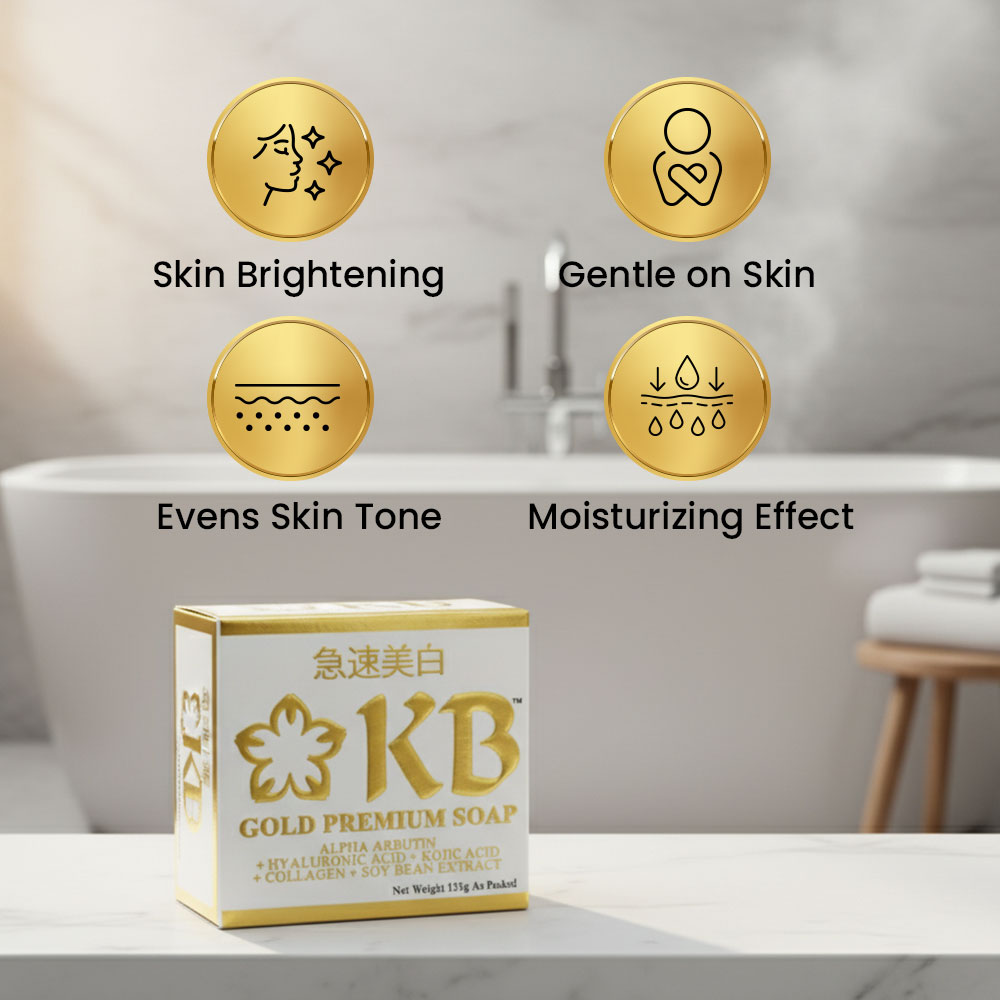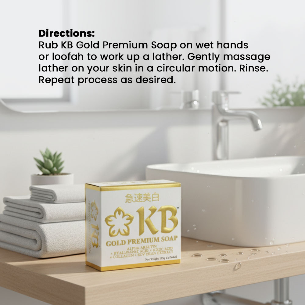 KB Gold Premium Soap is formulated with the right amount of kojic acid as second whitening agent only to alpha-arbutin to prevent unnecessary skin pigmentation and irritation.